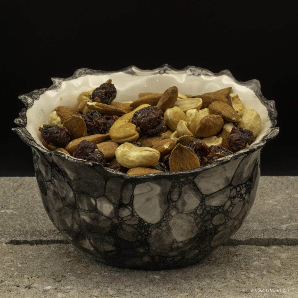 Skålen har en inskription i botten #No more nuts”. Bäst är den dock fylld!